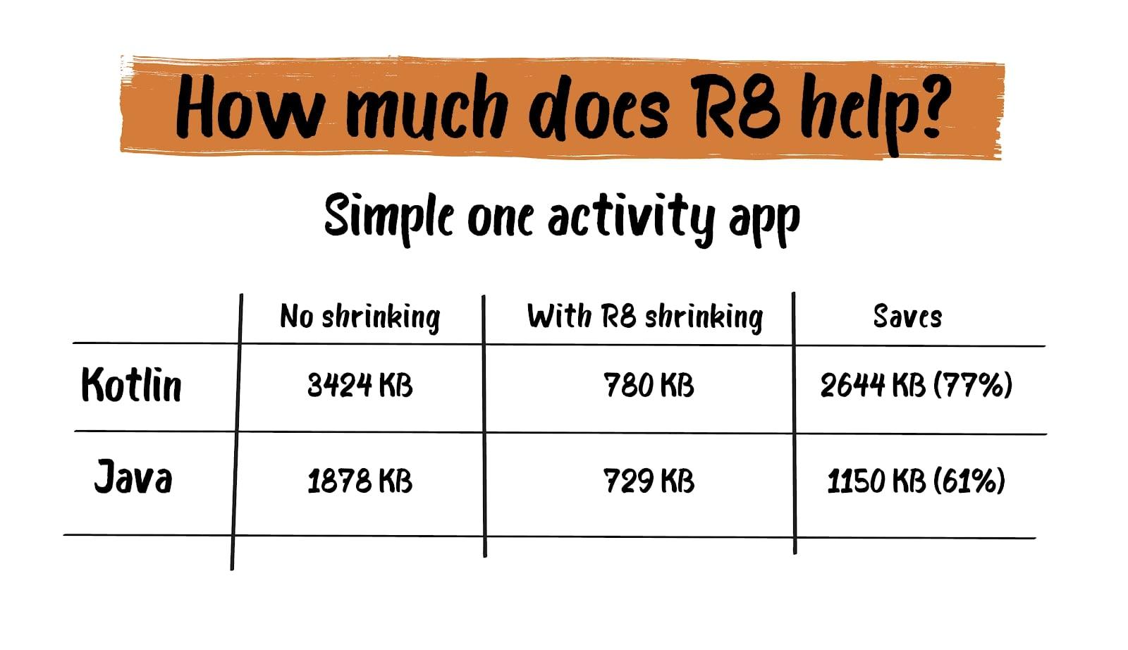 As an example, I will cite figures from the Shrinking Your App with R8 report presented at the Android Dev Summit ’19: