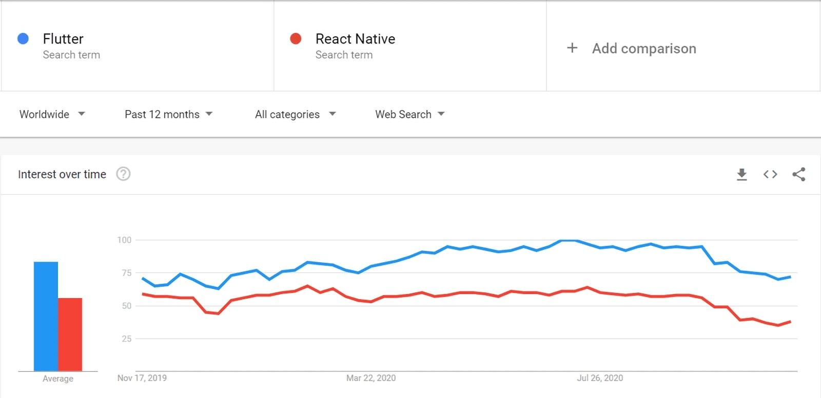 According to Google Trends statistics, React Native and Flutter are growing in popularity, albeit at different rates.