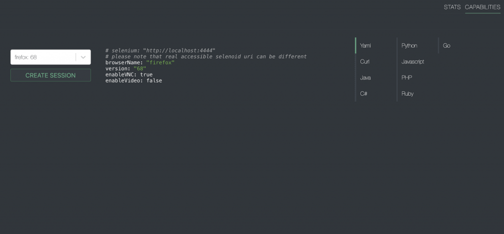 You can choose a browser from available browsers and UI will provide a setup example with the right capabilities. We can see from the screenshot that examples are available for several languages.