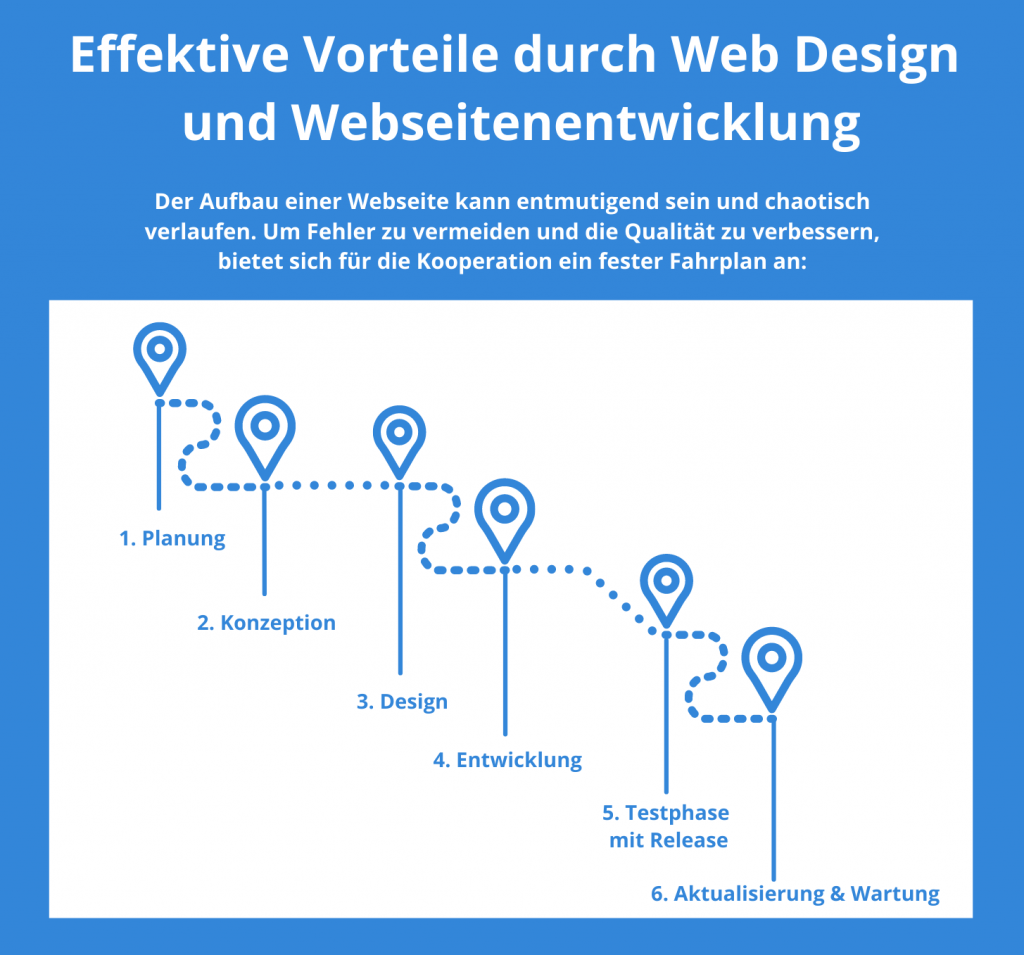 Die Zusammenarbeit mit einer Webagentur lässt sich gut mit einem Fahrplan mit vielen Etappenzielen als Stationen vergleichen. Insgesamt gliedert sich die Kooperation in der Regel in die folgenden Phasen: