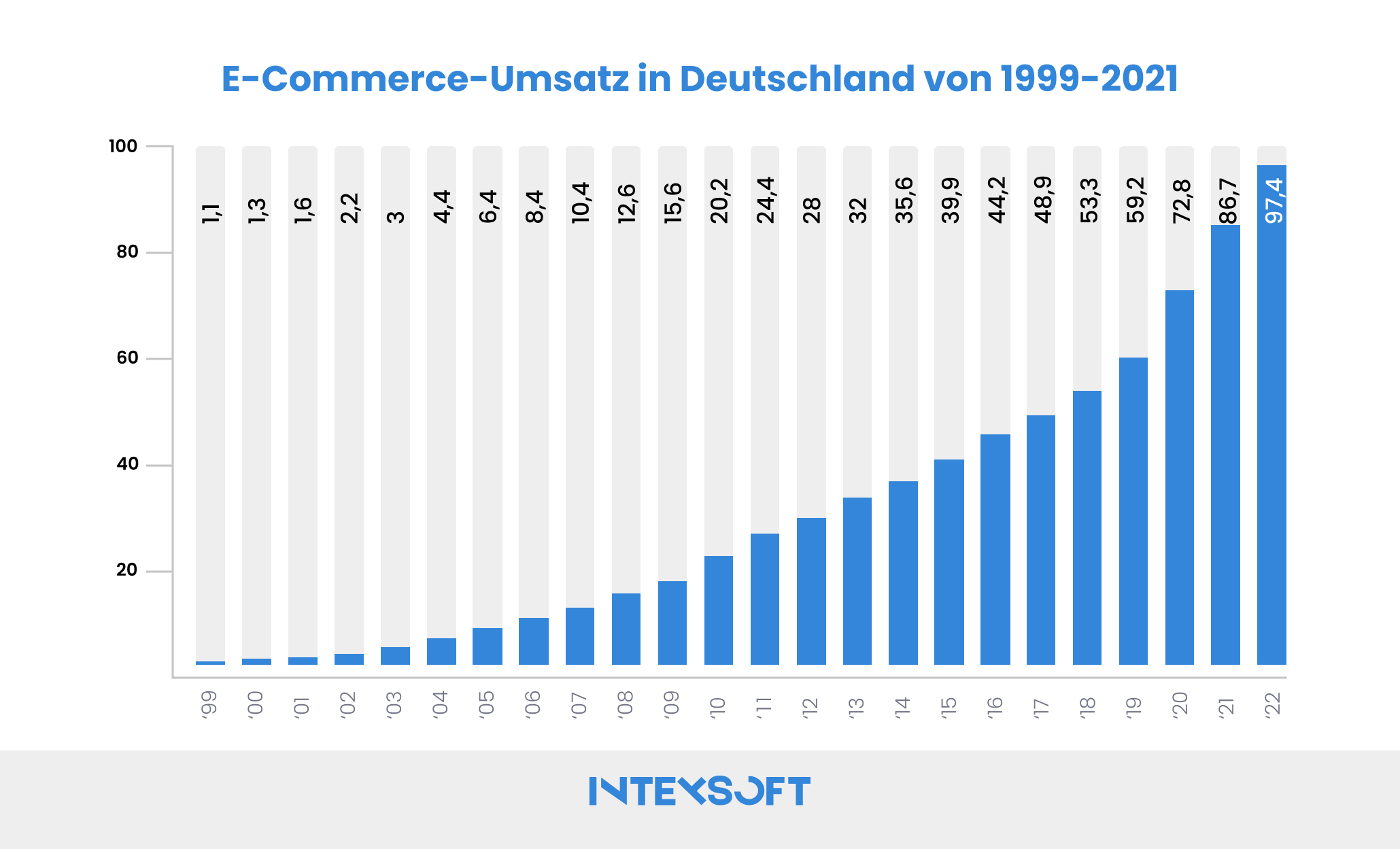 Laut Statista zeichnet sich bereits seit der Jahrtausendwende ein deutliches Wachstum des E-Commerce-Markts ab. Im Jahr 2021 wurden allein im B2C-E-Commerce 87 Milliarden Euro Umsatz erzielt. Knapp ein Viertel des Umsatzes lässt sich auf den Vertrieb von Bekleidung zurückführen.