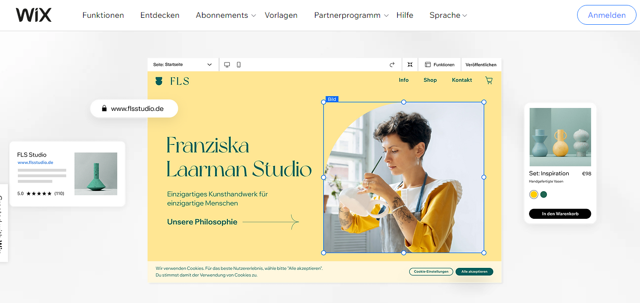 Wix gilt als Marktführer im Bereich der Webseiten-Baukästen. Zielgruppe sind Selbstständige sowie kleine und mittelständische Unternehmen. Wer über Vorkenntnisse verfügt, kann eigene Codes einbringen. Der Wix-Editor erleichtert die Bedienung für alle, die keine Programmierkenntnisse mitbringen.