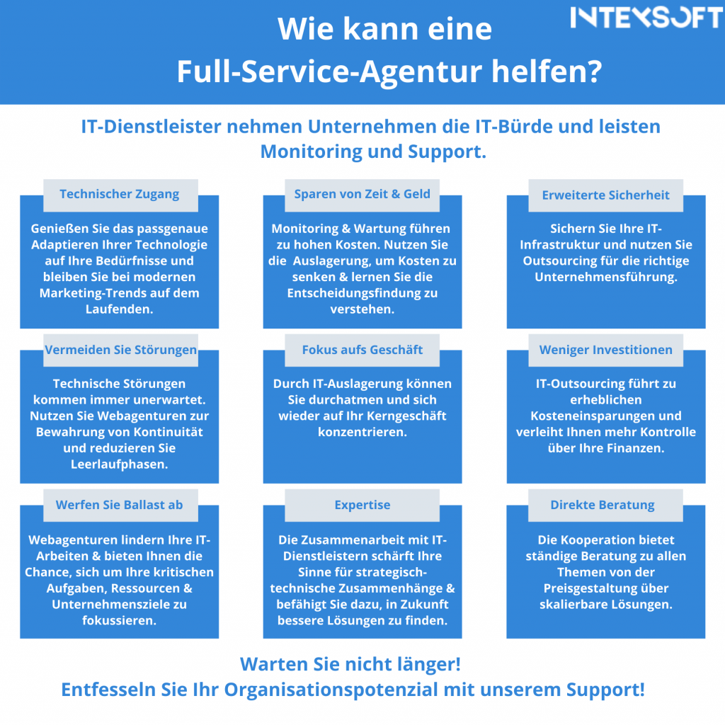 Durch die Zusammenarbeit mit Internetagenturen ergeben sich viele Vorteile für das Unternehmen. Die wichtigsten Vorzüge der IT-Services im Überblick: