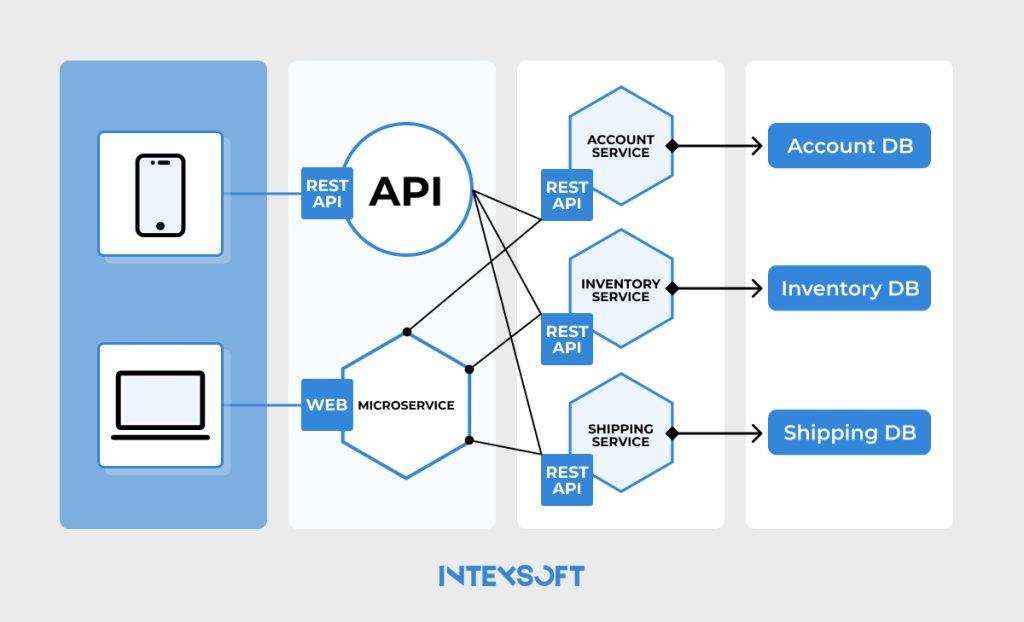 An application consisting of several microservices and their communication between them via APIs is conceptualized visually in an ecommerce website architecture diagram.