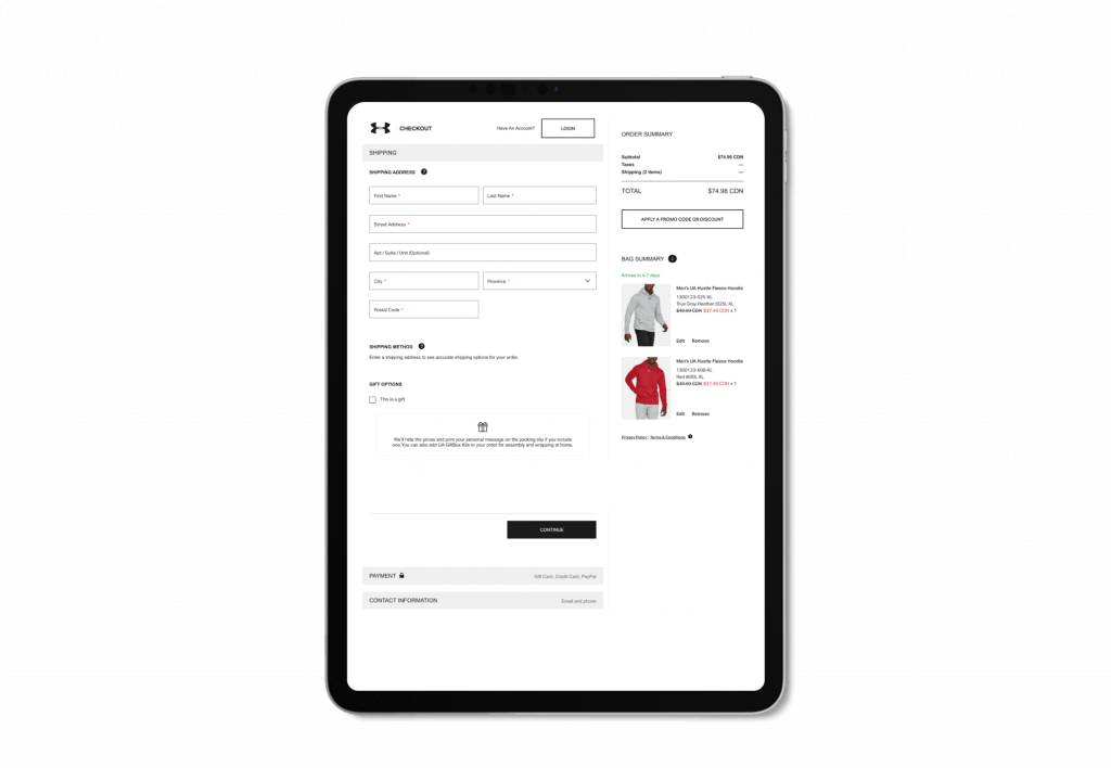 Here is a one-page checkout example from Under Armour. This checkout form works because it contains everything on a singular, UX-pleasing page. Note that the payment options include PayPal and gift cards.