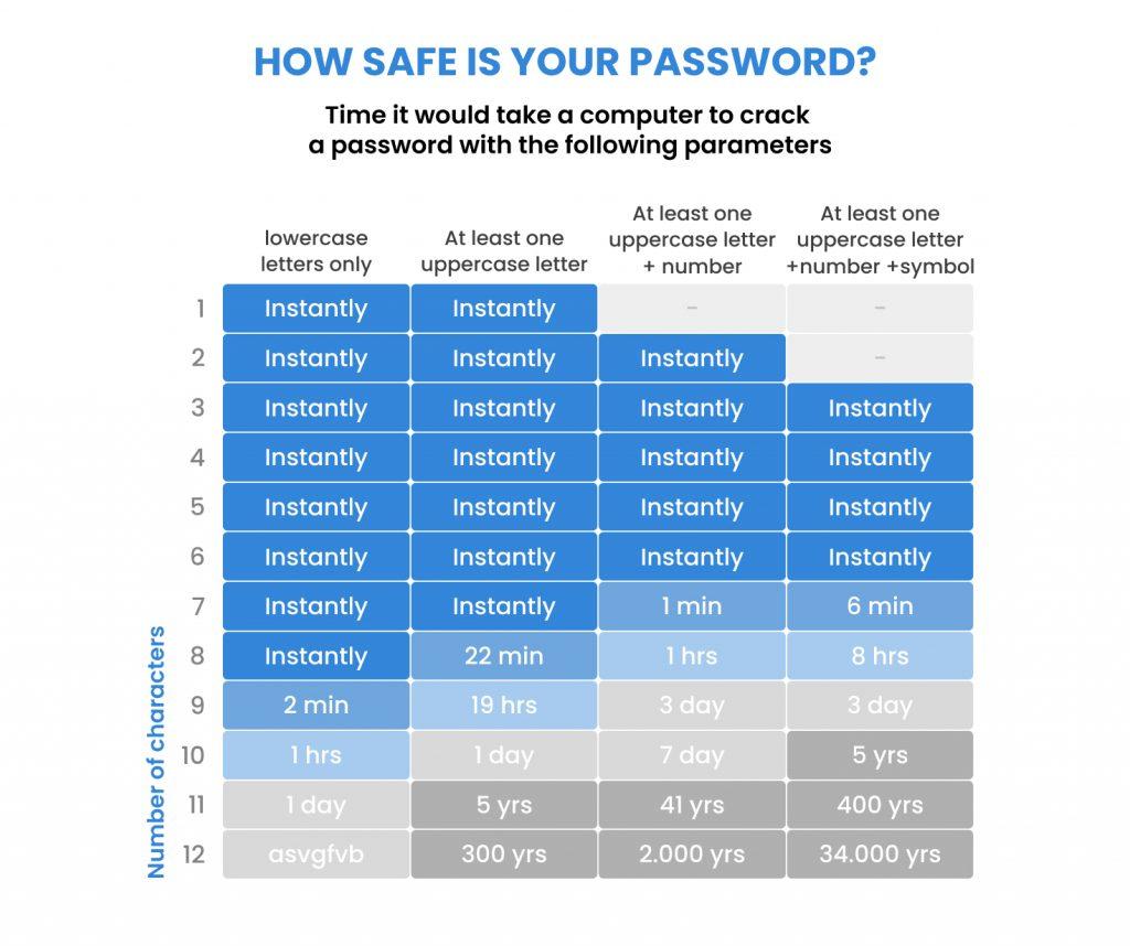 You need to create strong passwords that contain numbers and special characters as well as a mixture of lowercase and uppercase letters. Use the graph above as a guideline to teach all site admins the importance of increasing the password difficulty.