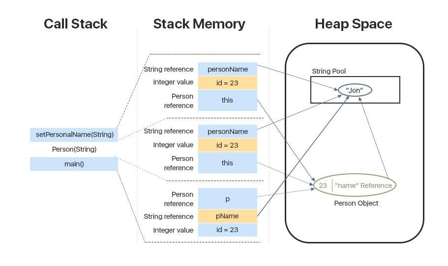 - The reference variable of String argument personName which will point to the actual string from the string pool in the heap memory