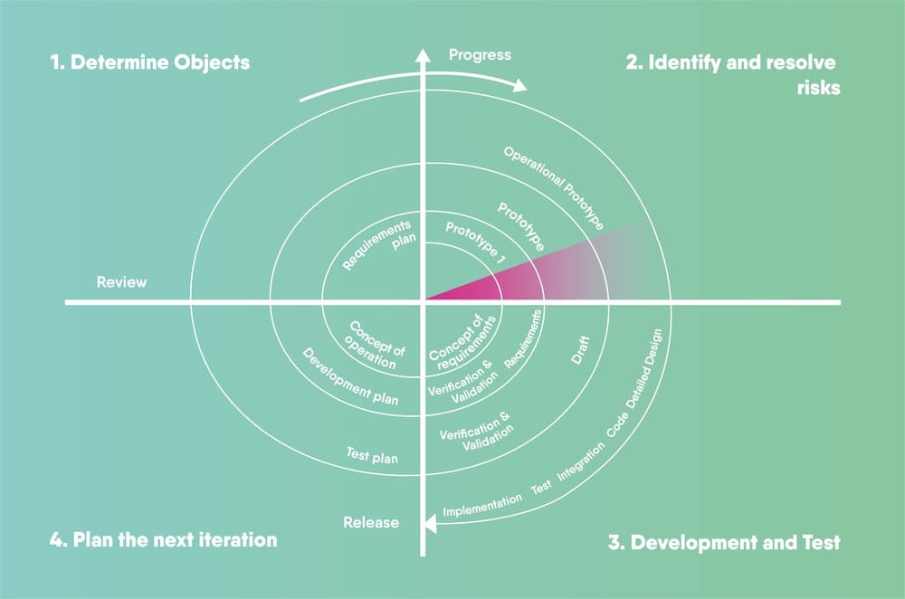 In this model, the product’s life path is like a spiral, which gets unwound from the planning stage, and with the passage of every further step. Thus, at the exit from another round, we get a ready-tested prototype that complements the existing assembly. If the prototype meets all the requirements, it can be released.