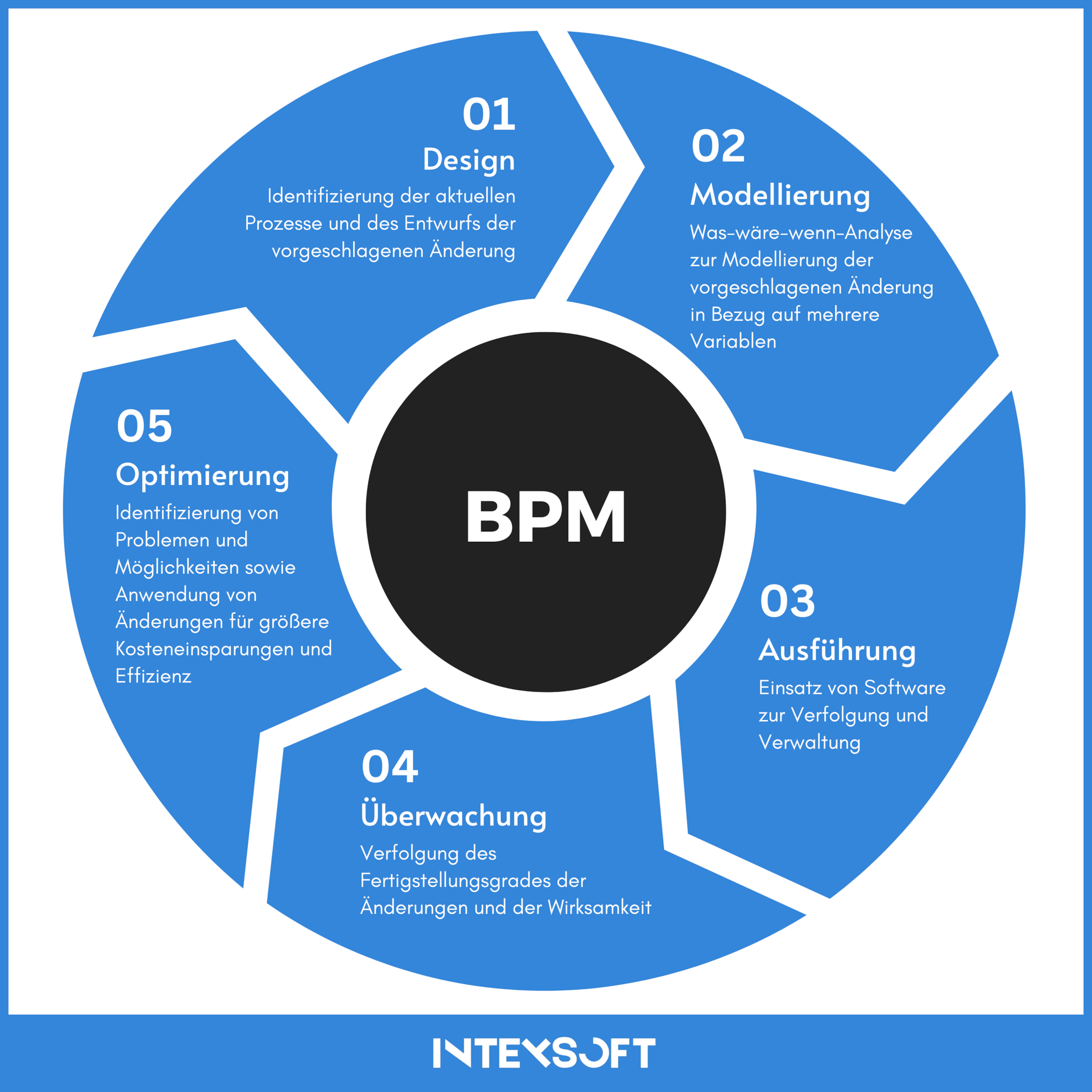 Dabei werden bestehende betriebliche Geschäftsprozesse analysiert, modifiziert, überwacht und optimiert. Das Zentrum des BPM bildet die Erstellung einer Workflow-Vorlage im Sinne der Realisation der übergeordneten Unternehmensziele. Unterstützend wird eine Automatisierungssoftware eingesetzt.