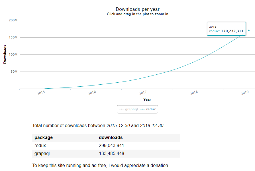 Based on the chart, we see that the increase in usage is obvious. It is also worth mentioning that Redux is typically used with React, which also holds the forefront.