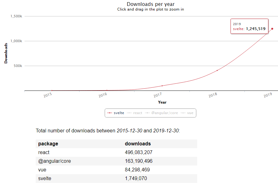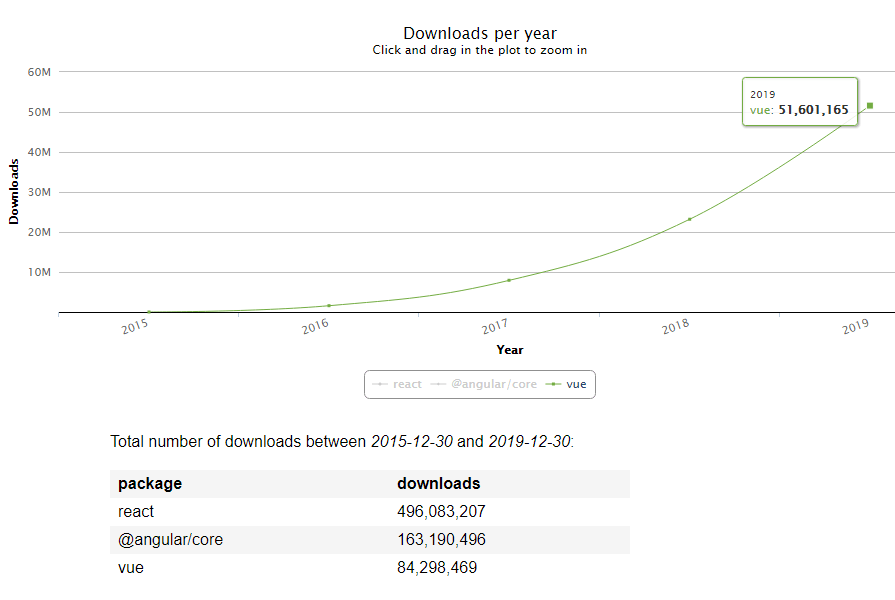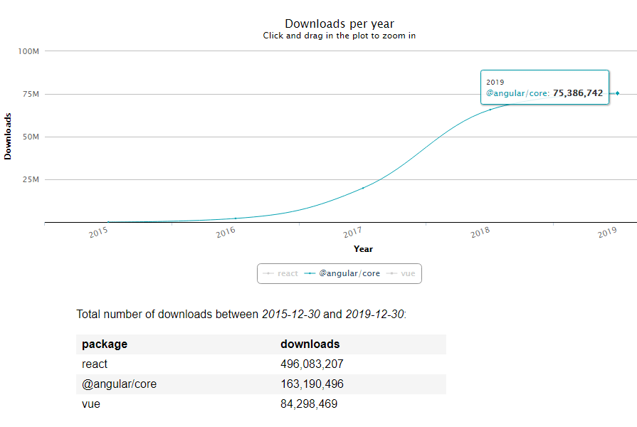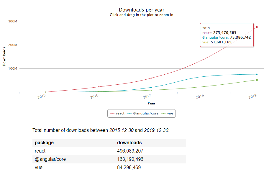 Over the past few years, the level of React usage has increased significantly. If you look at the number of npm-packages downloads, which indicates the activity of using the framework, you will see that React clearly dominated in 2019 (and for the last 5 years as well):