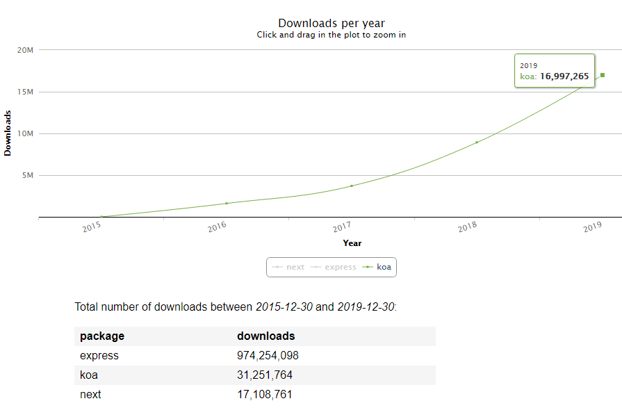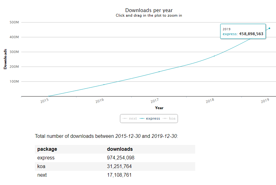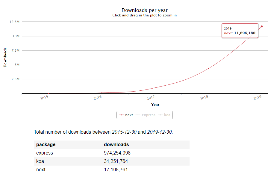 The growth of Next usage is relatively the same as Koa’s. It will keep evolving not only due to its advantages: the framework is supported by an organization that is stable and very active within the open-source community.