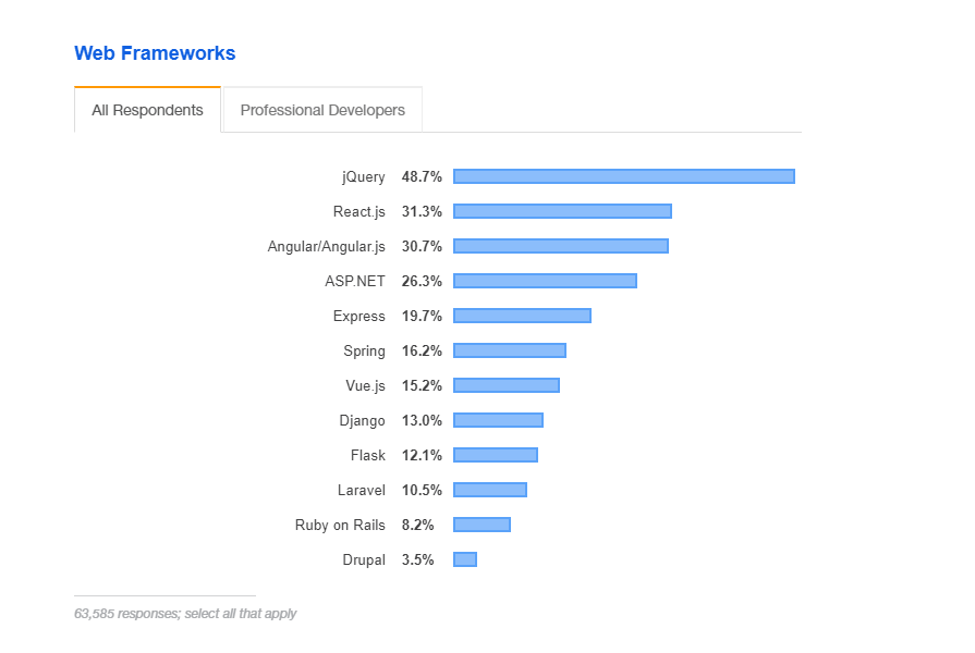 Taking into account the fact that Vue.js is younger than React and Angular.js, it is not surprising that now it occupies the middle position among the other frameworks.