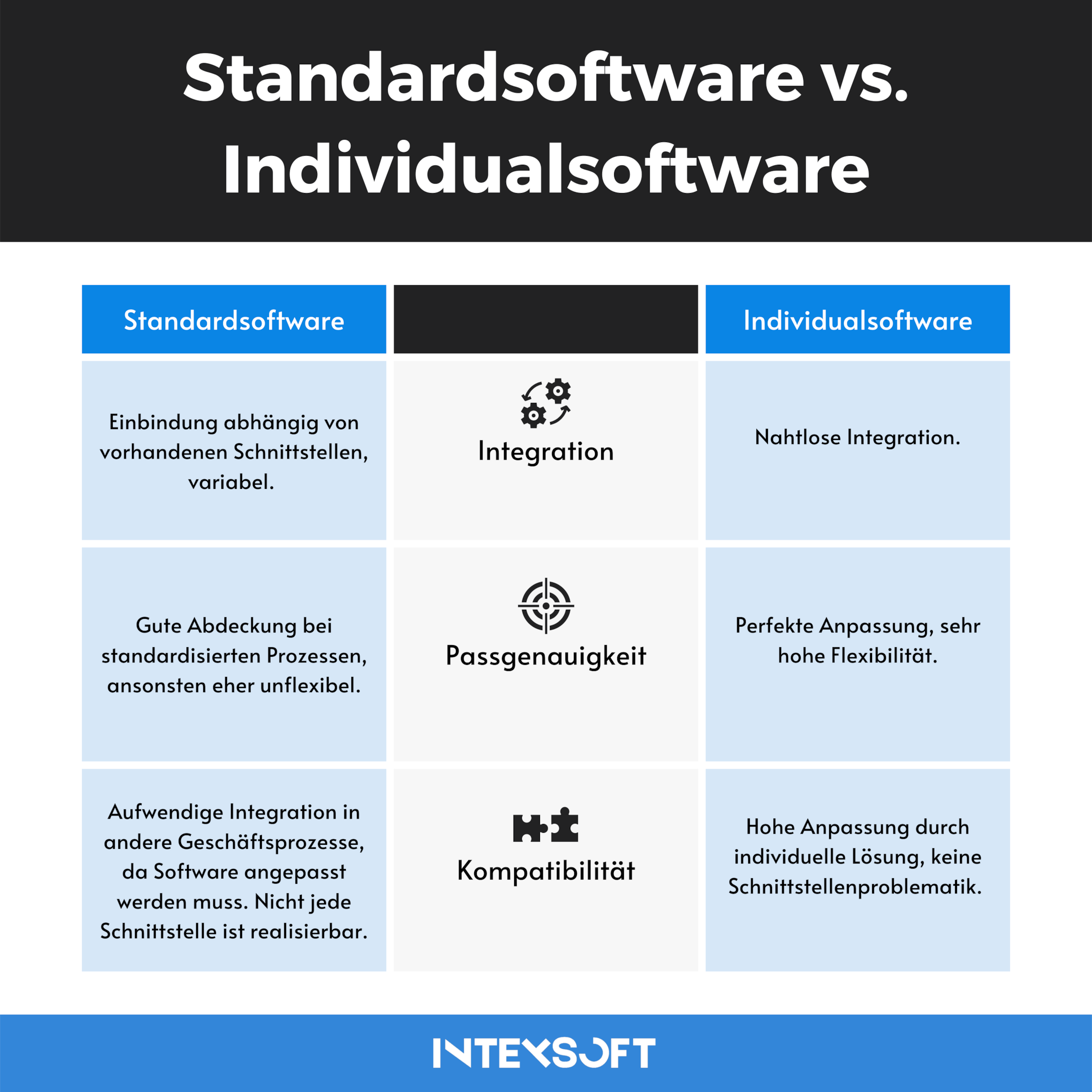 Die Umsetzung wird entweder intern oder durch einen externen Dienstleister wie intexsoft.com realisiert. Die Vorteile: Das System wird eigens an die Anforderungen des Unternehmens angepasst. Zudem kann der Umfang der Leistungen im Einzelfall bestimmt werden, wobei Änderungen oder Anpassungen jederzeit vorgenommen werden können.