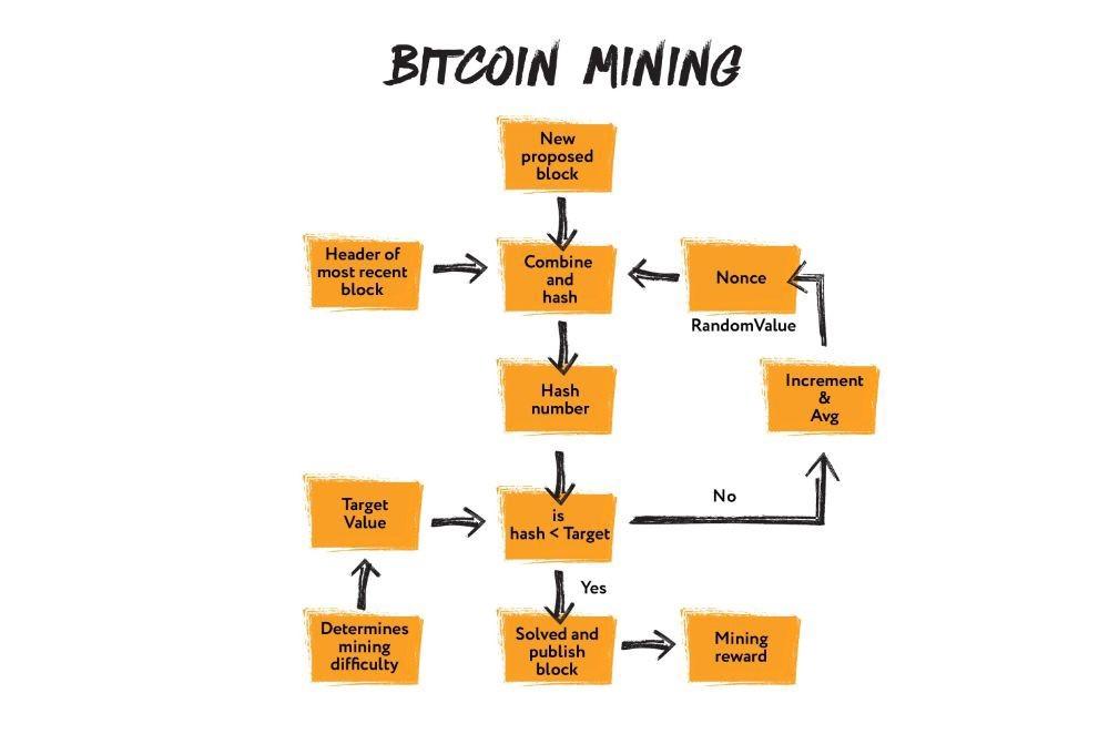 It is a rather simple process. We have a block (with its own hash value, time, etc.) and a number called NONCE.